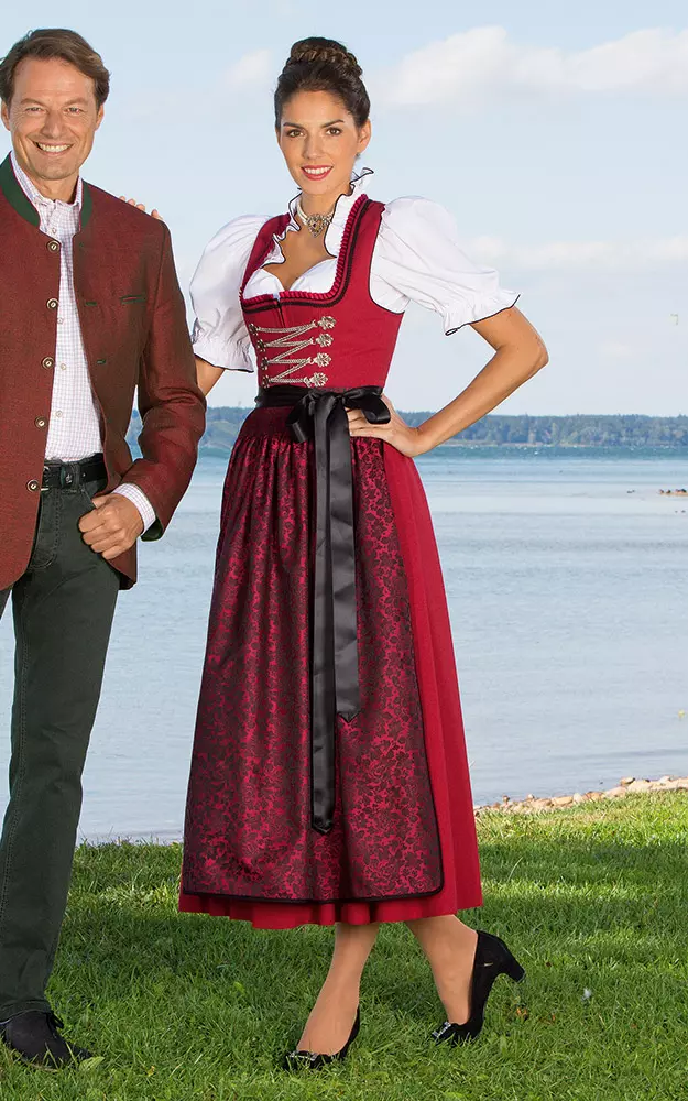 Stilvolles Miederdirndl mit faltengelegtem Rock in Trachtenlänge 90 cm. Das Oberteil ist aufwändig mit Satin-Faltenrüsche, Bortenbesatz sowie Filigranhaken und Silberketten-Schnürung akzentuiert. Dazu passen die Bluse mit markant schwarzer Kantenpaspelierung und die Schürze aus schimmerndem Rosen-Jacquard mit Satin-Schürzenbändern.Bitte beachten Sie, dass Dirndlkleider auf Figur gearbeitet sind und eng sitzen müssen. Gegenüber modischer Kleidung fallen sie daher eher klein aus. Bitte beachten Sie deshalb unsere Maßtabelle.Die Seitennähte unserer Modelle sind so versäubert, dass Sie leicht um bis zu eine Konfektionsgröße enger oder weiter gemacht werden können.Bei Fragen beraten wir Sie gerne telefonisch.Im Preis enthalten ist das Dirndl ohne Schürze, ohne Bluse oder weitere abgebildete Artikel.