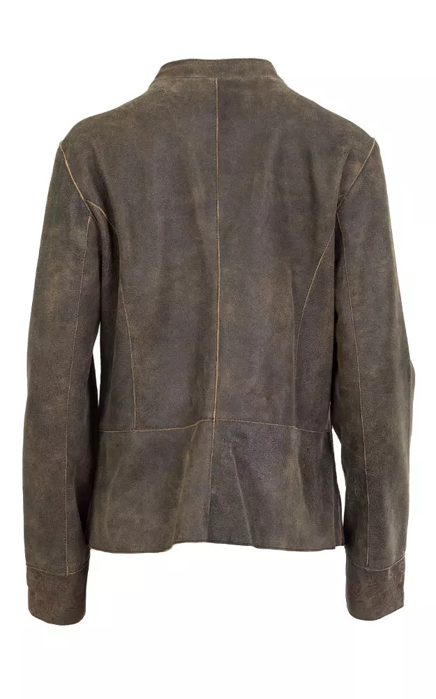 Traumhaft weich ist diese leicht taillierte Lederjacke mit tonigen Stickverzierungen.