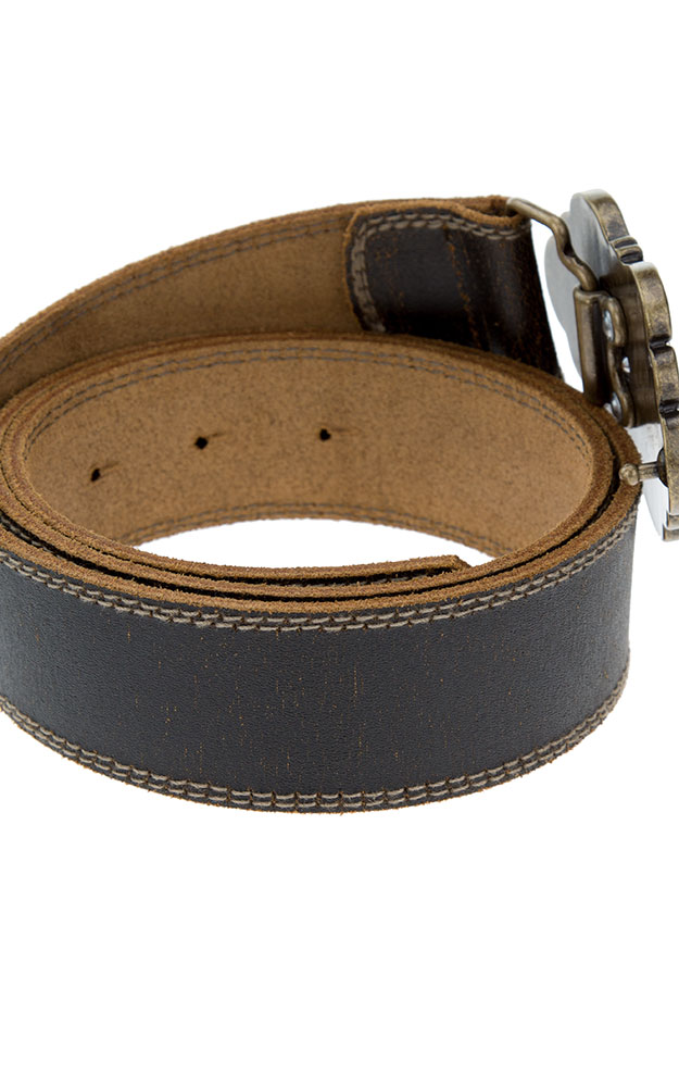 Dunkelbrauner Herrengürtel mit Doppelnaht am Riemen und silbern-/messingfarbener Schnalle.