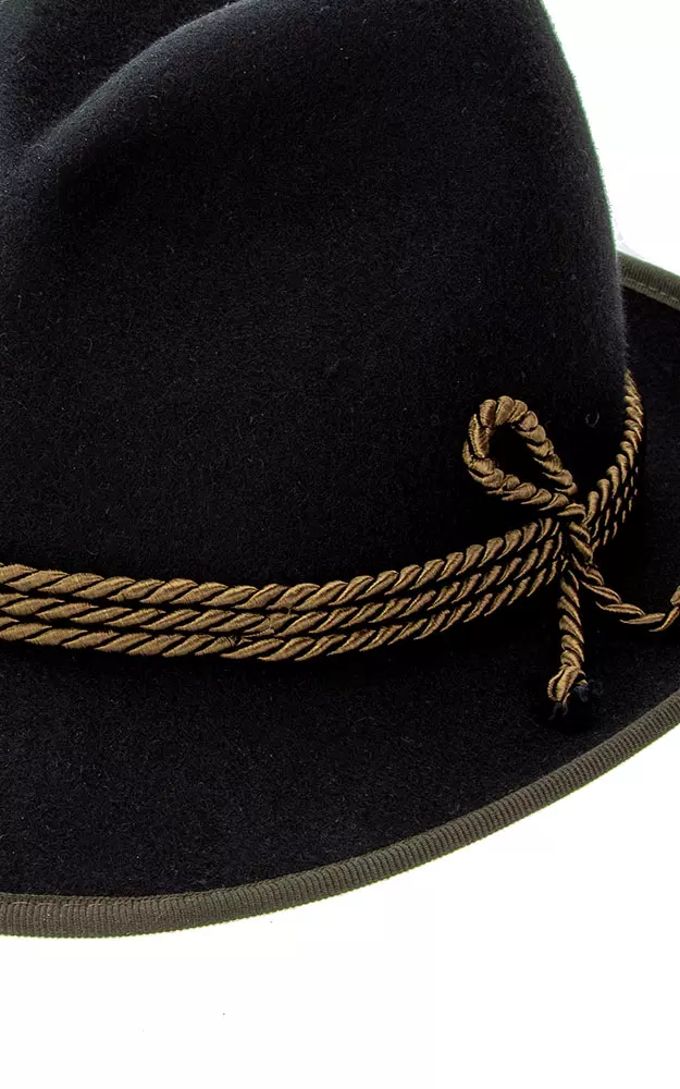 Hochwertiger Hut aus Merinowolle in klassischer Form mit typischer Falte. Der Rand ist schmal gehalten und zur Rückseite hochgehend. Garniert wird der Hut mit einer Flechtkordel, das Hutband ist aus Stoff gefertigt.
