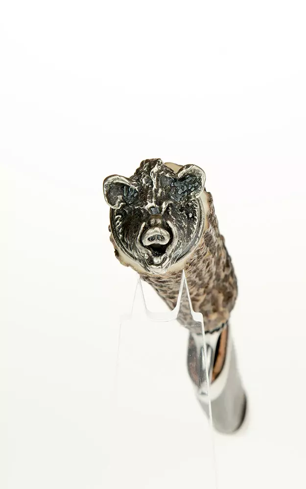 Der Übergang zwischen Klinge und Griff wird von einer versilberten Zwinge verziert. Am Ende des Griffs aus echtem Hirschhorn befindet sich ein kunstvoll versilberter Wildschweinkopf.