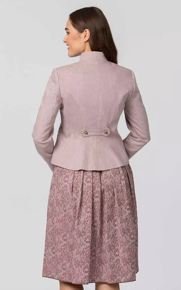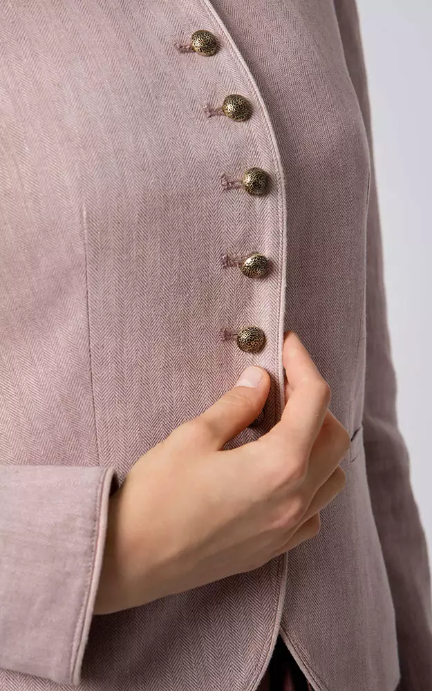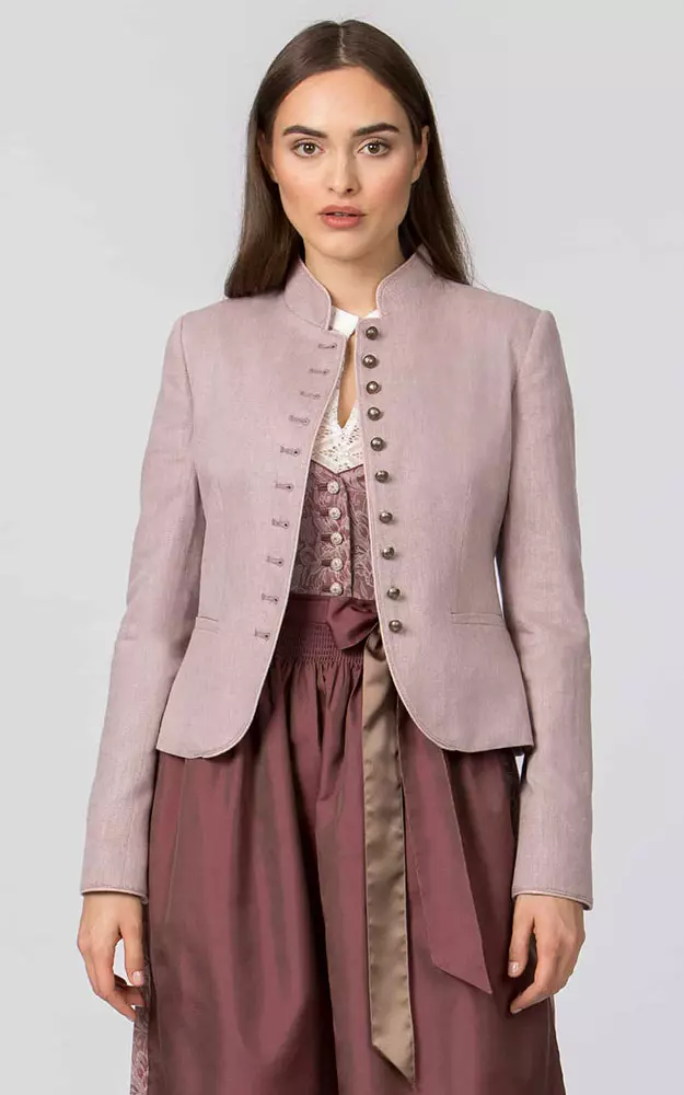 Leicht taillierte Leinenjacke mit Stehkragen und kleinem Faltenschößchen im Rücken.