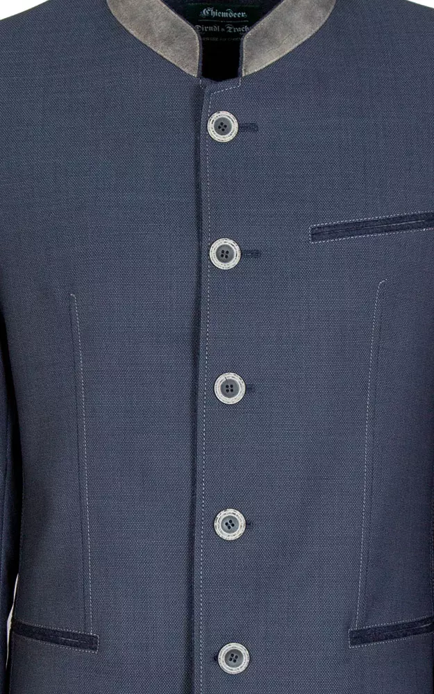 Leicht tailliert geschnittener Trachtenjanker mit 2 Innentaschen. Das Taft-Innenfutter ist in leicht schimmerndem Blau gehalten.