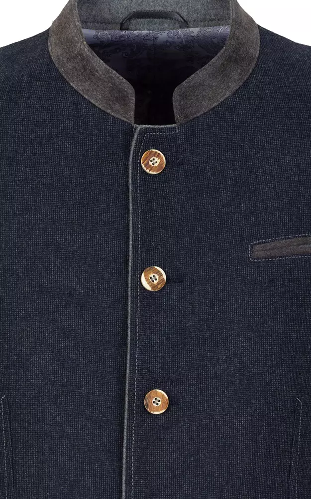 Leicht tailliert geschnittener Trachtenjanker, gefüttert, mit zwei Innentaschen und grauem Ausputz am Kragen.