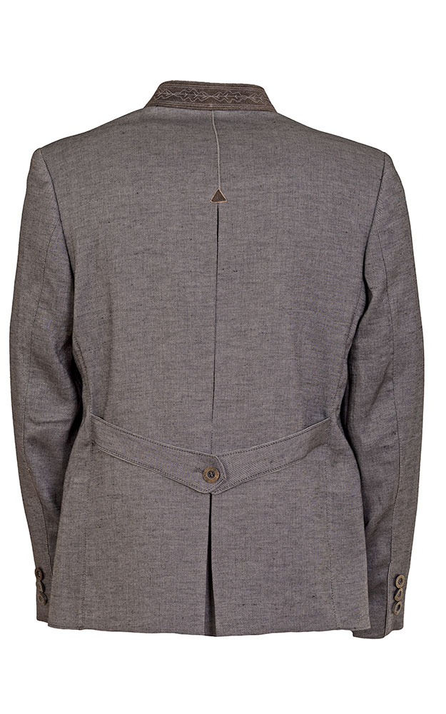 Leicht tailliert geschnittener Trachtenjanker, gefüttert, mit drei Innentaschen und Lederausputz am Kragen.