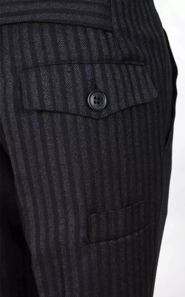 Kinder-Stresemann-Hose mit Spitzbund aus reiner Schurwolle mit verstellbarem Riegel, zwei schrägen Eingrifftaschen, Gesäßleistentasche mit Patte und Knöpfen für Hosenträger. Zusätzlich ist rechts eine Messertasche, Vorder- und Hinterhosenabfütterung und ein Bundfutter eingearbeitet.