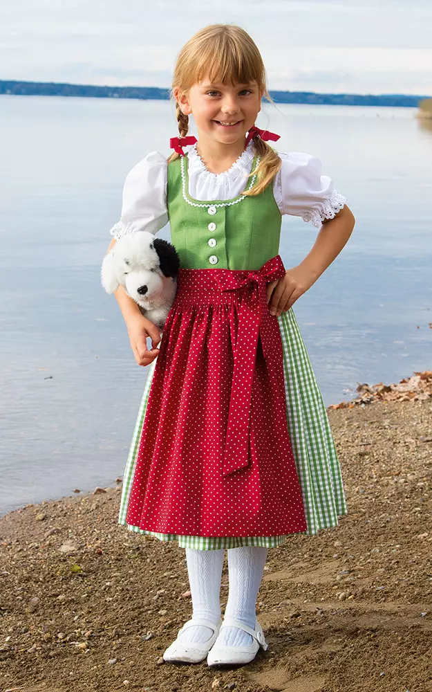Süßes Kinderdirndl mit Zackenlitze und echten Perlmutt-Knöpfen am Oberteil, faltengelegtem Karo-Rock aus reiner Baumwolle und fröhlicher Tupfenschürze. Passend dazu: Die Bluse ist mit zierlichen Spitzen ausstaffiert.Weitere oben abgebildete Artikel sind nicht im Preis enthalten.