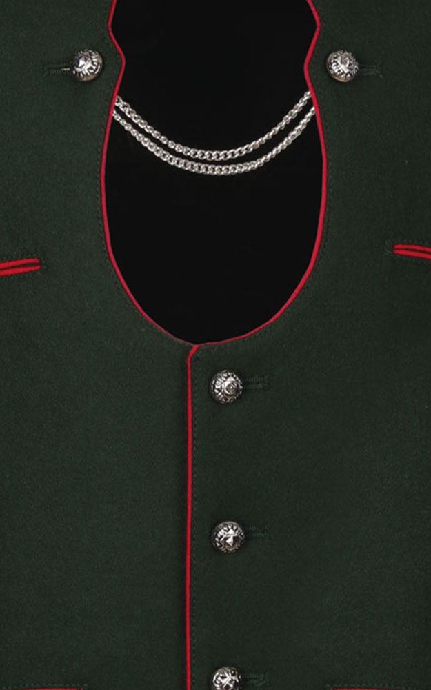 Traditionelle "Bayern-Weste" mit roter Kontrast-Einfassung, schwarzem Stoffrücken und typischem Ketterl-Verschluss.