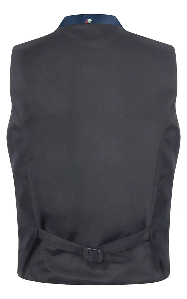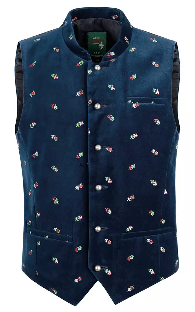 Samt-Trachtenweste, bestickt einreihig, Stehkragen, mit Metall-Kugelknöpfe, Stoffrücken mit Spange und drei Leistentaschen.