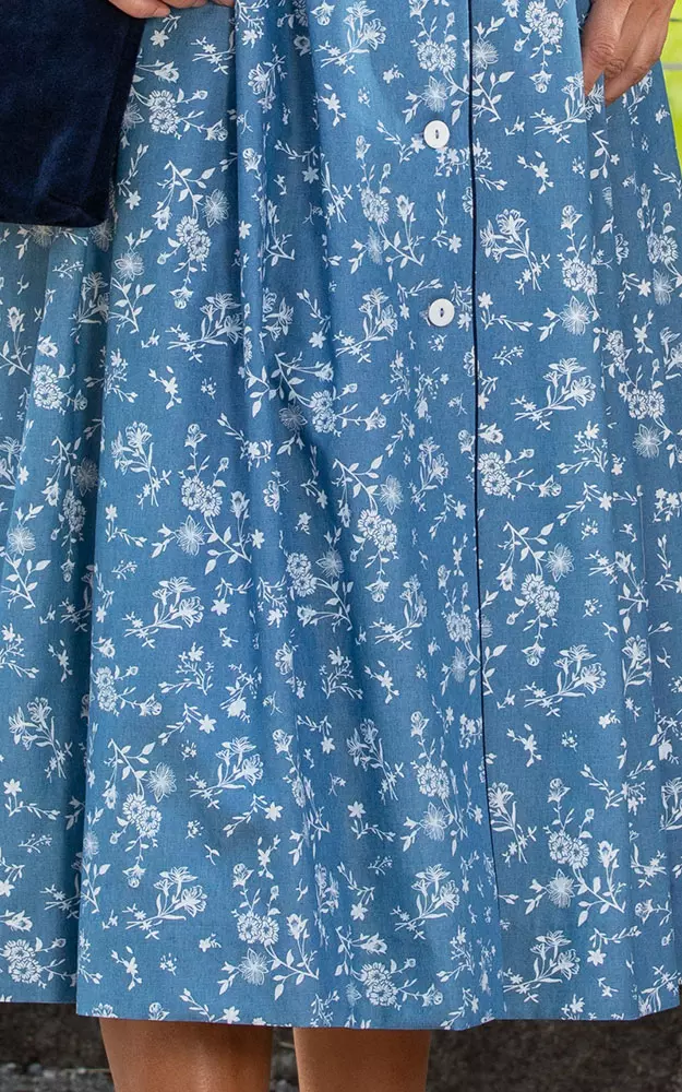Feminines, durchgeknöpftes Trachtenkleid aus Baumwollmischung in Jeans-Optik mit faltengelegtem Rock (Länge 80 cm) mit Kontrasteinfassung an Ausschnitt und Ärmeln. Separat erhältlich: Die Taille betont ein elastischer Gürtel mit Zierschließe.