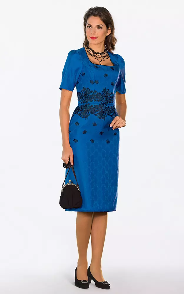 Elegantes Trachten-Etui-Kleid aus schimmerndem Jacquard mit extravagantem Bordüren-Muster, schwarzer Paspelierung am Ausschnitt, Rücken-Reißverschluss, Gehschlitz im Rock und schlanken Ärmeln.Bitte beachten Sie, dass Dirndlkleider auf Figur gearbeitet sind und eng sitzen müssen. Gegenüber modischer Kleidung fallen sie daher eher klein aus. Bitte beachten Sie deshalb unsere Maßtabelle.Die Seitennähte unserer Modelle sind so versäubert, dass Sie leicht um bis zu eine Konfektionsgröße enger oder weiter gemacht werden können.Bei Fragen beraten wir Sie gerne telefonisch.Im Preis enthalten ist das Dirndl ohne Schürze, ohne Bluse oder weitere abgebildete Artikel.