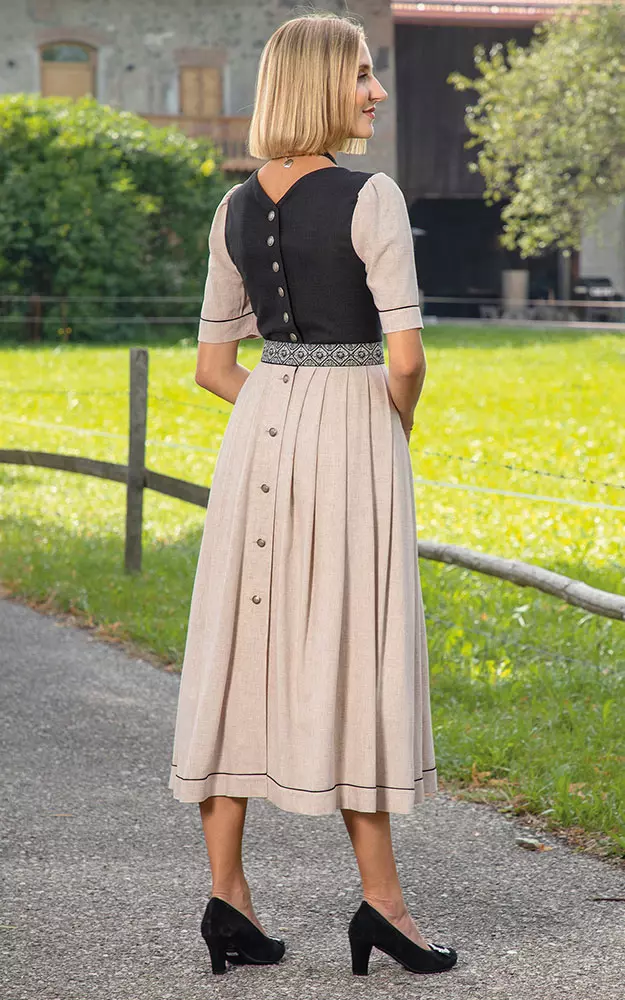 Außergewöhnliches Trachtenkleid mit Oberteil in Leinenoptik mit raffinierter Knöpfung im Rücken sowie markanter Paspelierung am faltengelegten Rock (Länge 80 cm) und an den Ärmeln. Perfekt harmoniert dazu der separat erhältliche, elastische Gürtel mit Metall-Schließe.