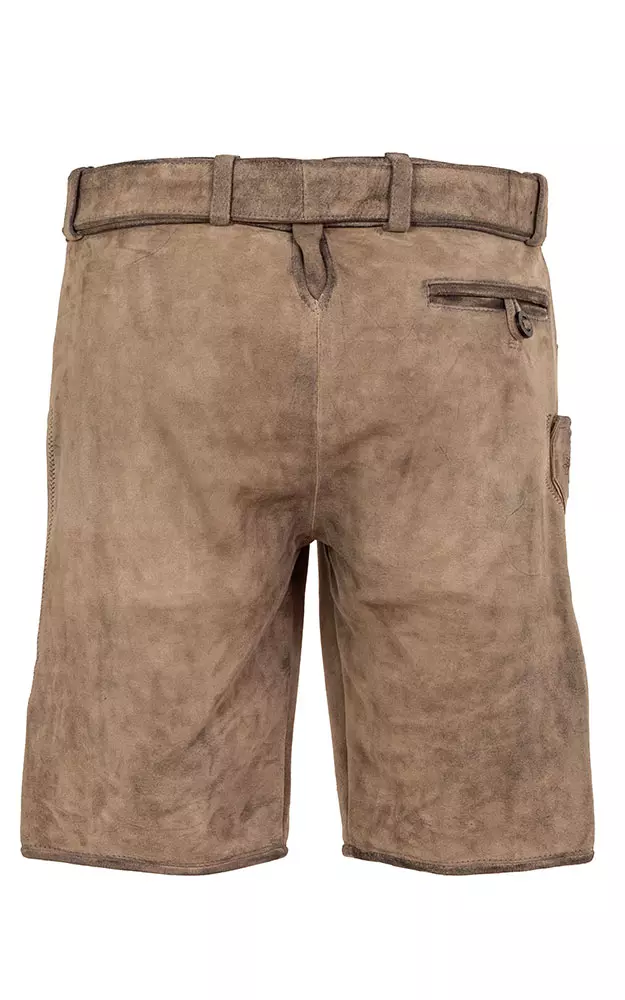 Urige Kurze aus weichem Wildbock-Veloursleder mit Messertasche, dezenter Stickerei, passendem Gürtel und Knöpfen an den Beinen.