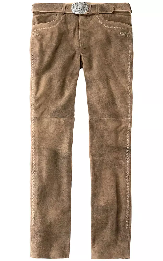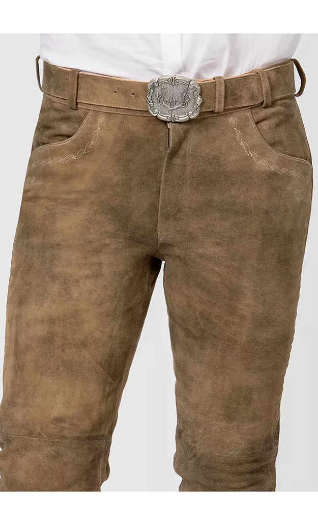 Lederhose aus herrlich weichem Ziegen-Veloursleder mit dezenter Stickerei an den Taschen. Taschen. Zusätzlich ist sie mit feinem Taft bis kurz unter das Knie gefüttert.