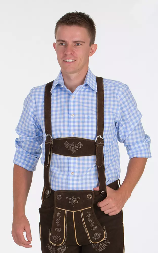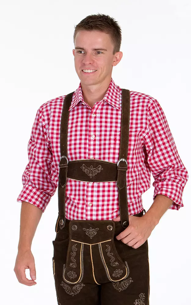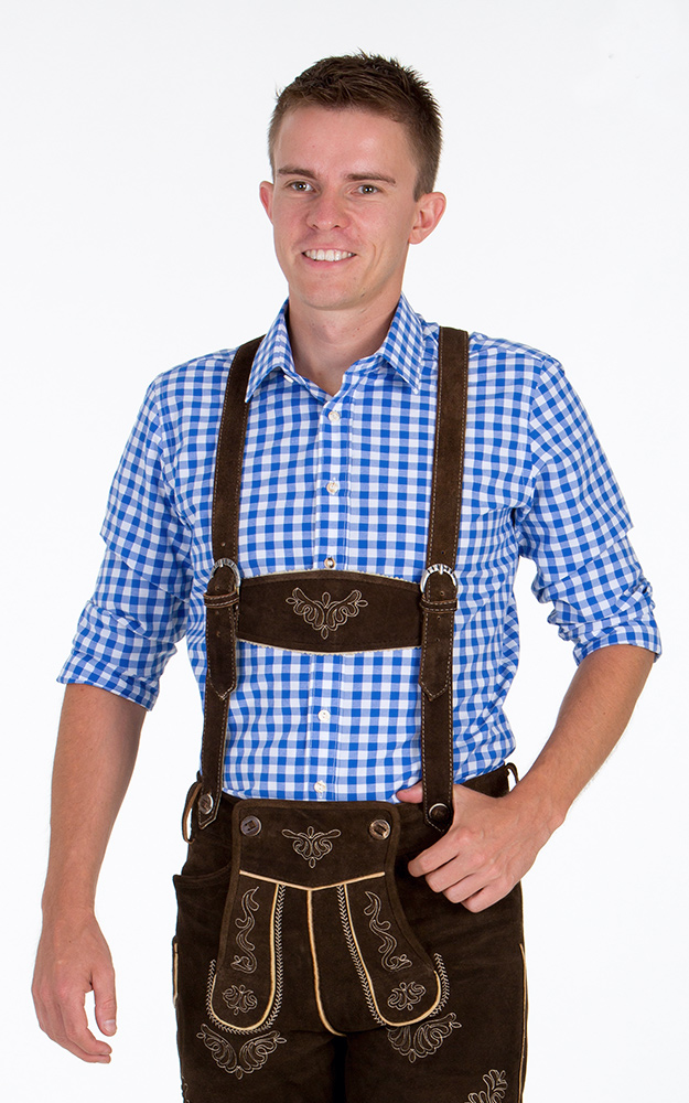 Die urige Kurze in Dunkelbraun mit Messertasche und plastischen Stickereien aus echtem Wildbock-Veloursleder (kein Spaltleder) inkl. Gürtel, entweder dem weißen Stehkragenhemd mit Riegel (100% Baumwolle), dem weißen Liegekragenhemd (100% Baumwolle), oder einem Karo-Hemd (60% Baumwolle, 40% Polyester) sowie Socken und Haferlschuhe.