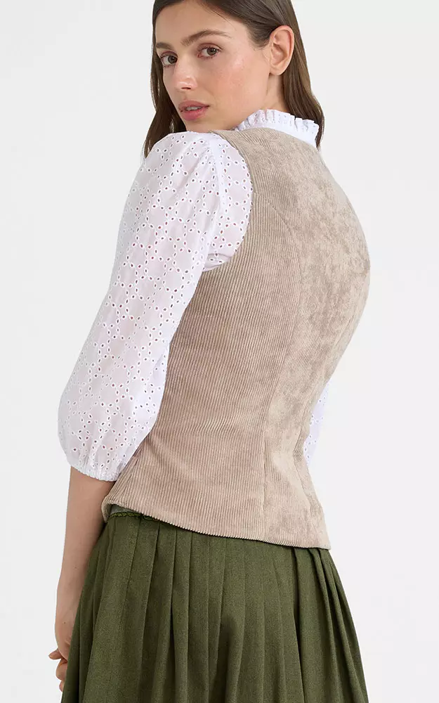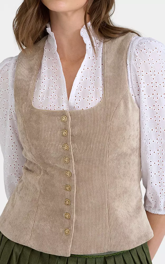 Das klassische Cord-Mieder mit farblich passenden Knöpfen ist ein zeitloses und vielseitiges Kleidungsstück, das sich mühelos in Ihre Garderobe integrieren lässt. Der runde Ausschnitt verleiht dem Mieder eine elegante Note, während das Paspel im Ausschnitt für zusätzliche Raffinesse sorgt. Komplett gefüttert und mittellang geschnitten, ist dieses Mieder die perfekte Wahl für verschiedene Anlässe, egal ob im Alltag oder bei festlichen Veranstaltungen. Tragen Sie es zu Hosen oder Röcken, um Ihrem Look eine traditionelle und stilvolle Note zu verleihen.