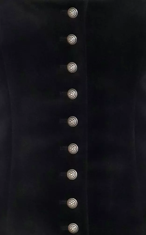 Klassisches, rund ausgeschnittenes Mieder aus super weichem Samt. Komplett gefüttert, Paspel im Ausschnitt, hochwertige Knöpfe.