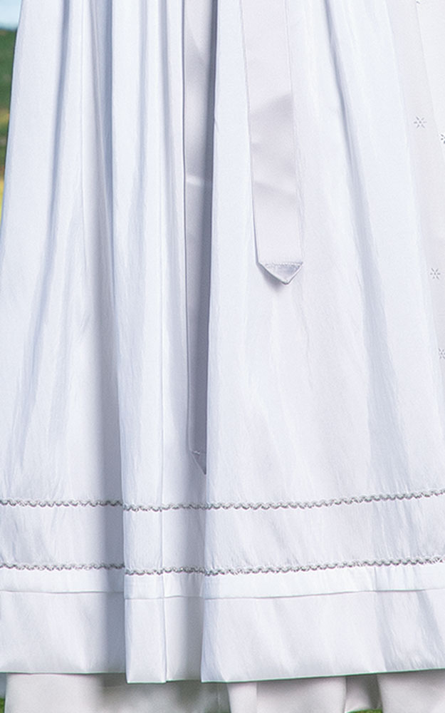 Zart glänzende Taft-Schürze ist mit Satin-Schürzenbändern und Silberborten.