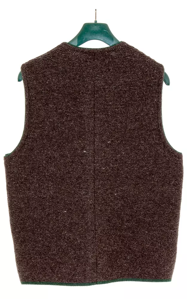 Hochwertige Strickweste aus reiner Schurwolle mit tannengrüner Kanten-Einfassung.