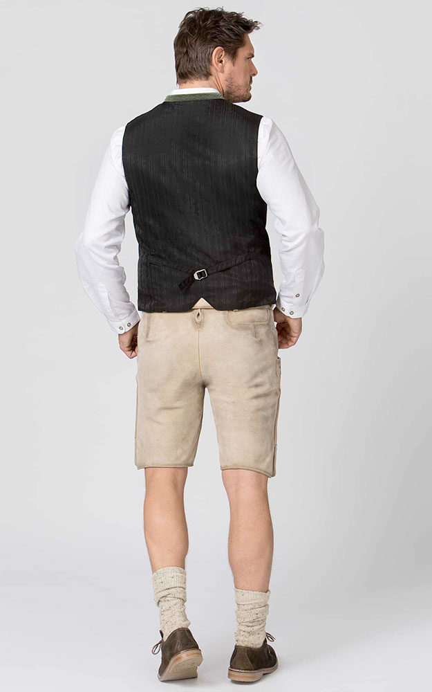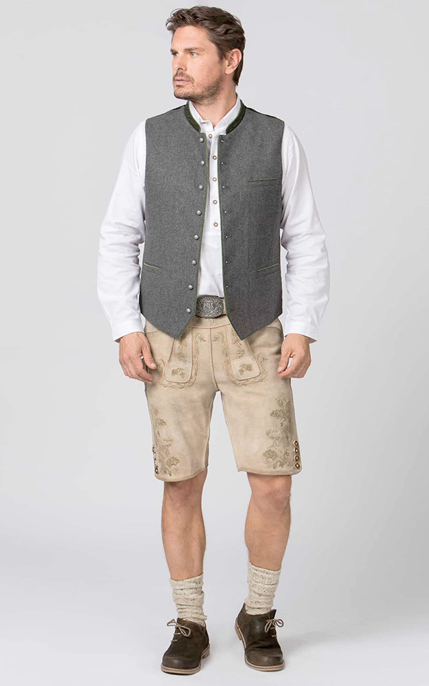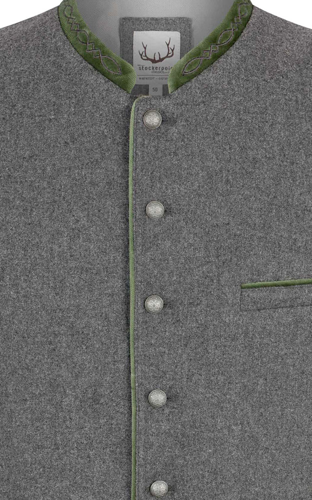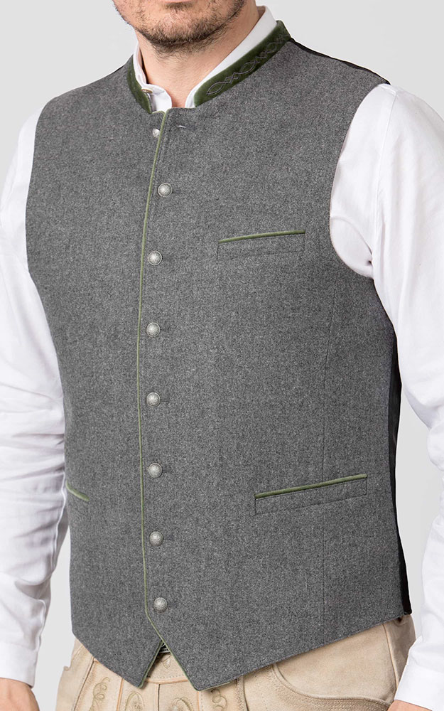 Die klassische Weste aus hochwertigem, melierten Lodenstoff ist der Klassiker unter den Trachtenwesten. Der Stehkragen ist aus feinem Baumwollsamt mit einer traditionellen Stickerei dezent bestickt und prägt den unverwechselbaren Stil. Farblich abgestimmte Paspel unterstreichen das traditionelle Design. Die klassische, gerade Schnittführung garantiert eine sehr gute Passform und einen angenehmen Tragekomfort. Der Rücken ist aus einem exklusiven, schwarz gestreiften Satinstoff gefertigt und lässt sich mit einem Riegel verstellen. Geprägte Kugelknöpfe aus altsilber runden das edle Erscheinungsbild gekonnt ab. Die Trachtenweste ist der ideale Kombipartner zu unseren traditionellen Trachtenhemden und Lederhosen.