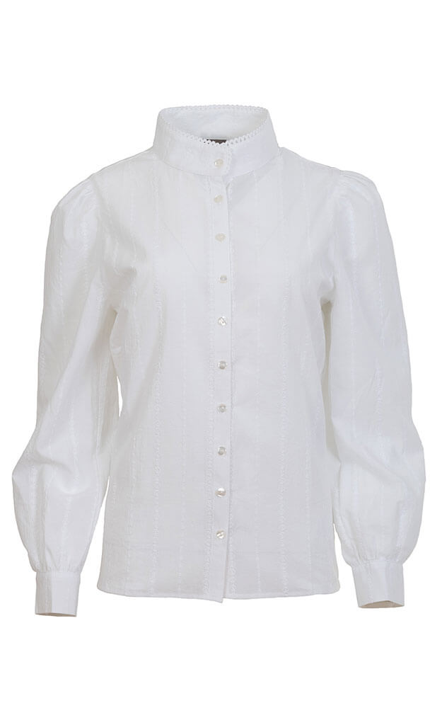 Elegante Stehkragen-Bluse aus feinem, besticktem Baumwoll-Blusenstoff. Der angereihte, lange Arm mit geknöpfter Manschette verleiht der Bluse eine klassische Note.