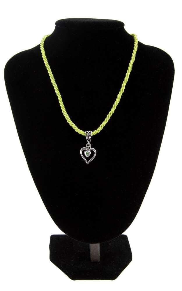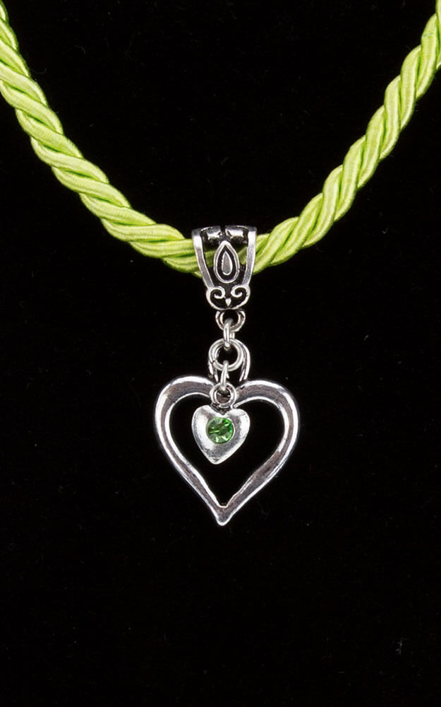 Trachten-Collier aus einer gedrehten Kordel mit einem antik-versilbertem Metall-Anhänger. Das grosse Herz ist mit funkelnden Glas-Kristallen besetzt.