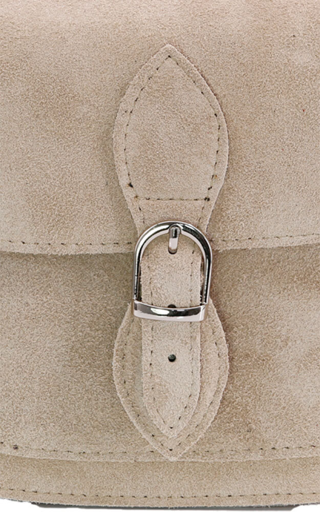 Traditionell anmutende Tasche in 21cm x 18cm Größe, mit Magnet-Schnallenverschluss vorne und Ösen seitlich zum Abnehmen des beigepacken Schulterriemens. Kleines Einsteckfach unter der Verschlussklappe für Kleinigkeiten, Innenfach durch Reissverschluss geschlossen.