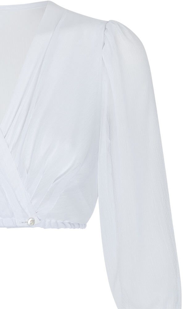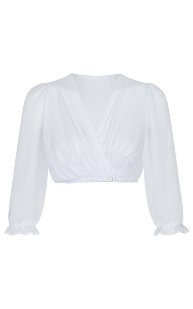 Wickelbluse aus Chiffon mit verstellbaren Knopfverschluss, ¾ Arm mit schmaler Rüsche am Ärmelsaum, vorne geknöpft.