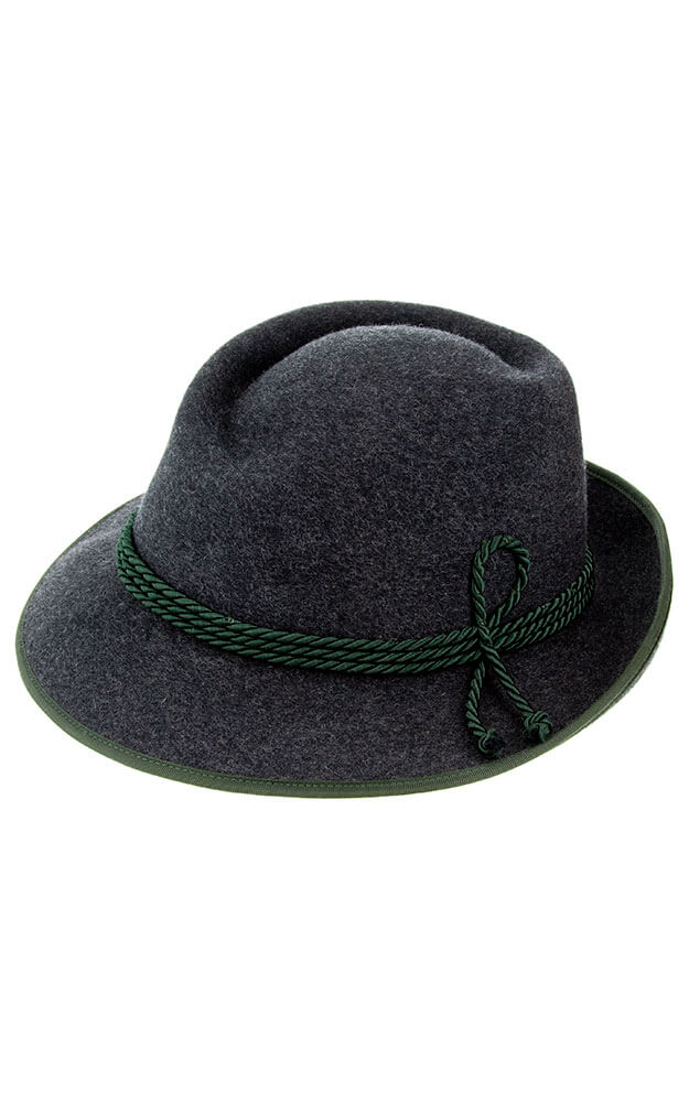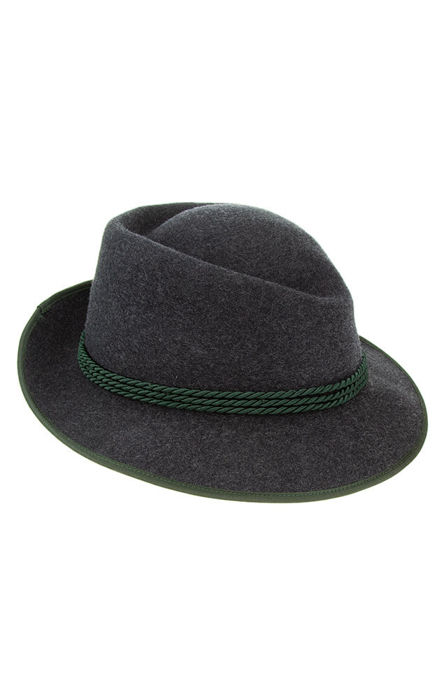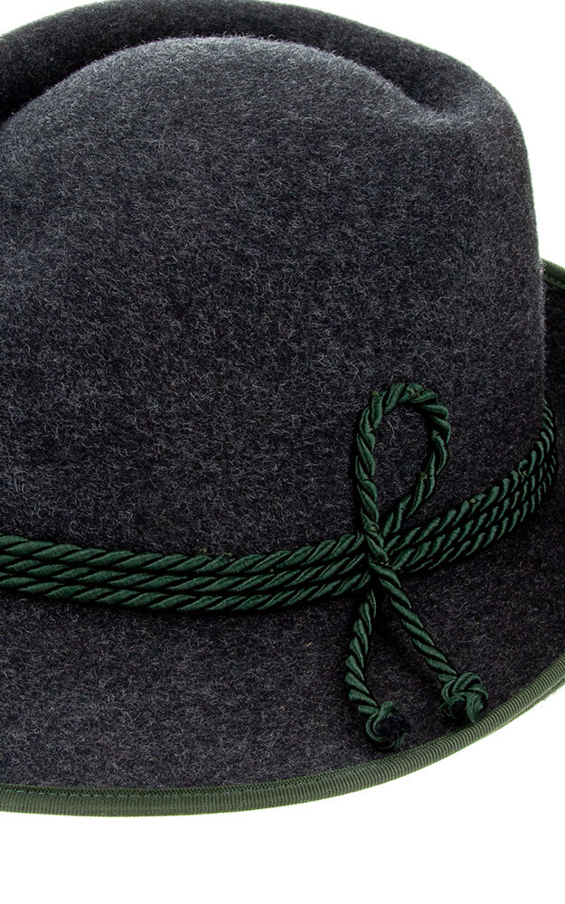 Hochwertiger Woll-Hut mit typischer Sechser-Falte. Garniert wird der Hut mit einer Flechtkordel. Das Hutband ist aus Stoff gefertigt.