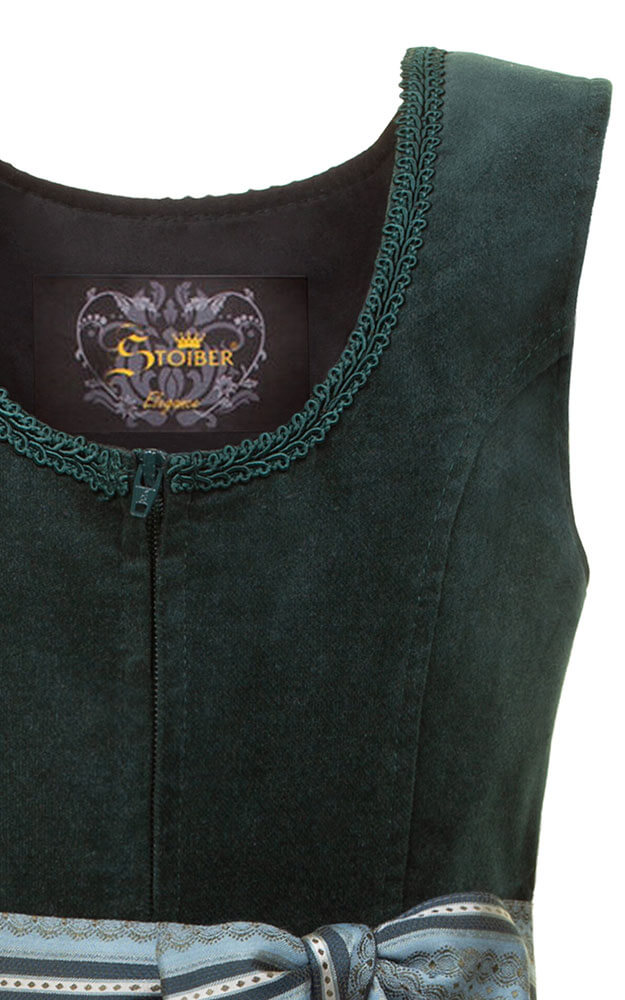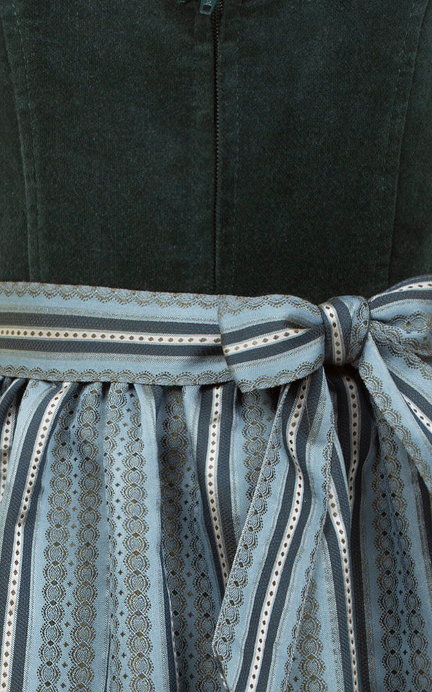 Bei diesem edlen Samtmieder ziert eine farblich passende Borte den Ausschnitt. Die Akzente sind hier durch die gestreifte Jacquard-Schürze und ab Gr. 128 dem Zieranhänger am Reißverschluss gesetzt.
