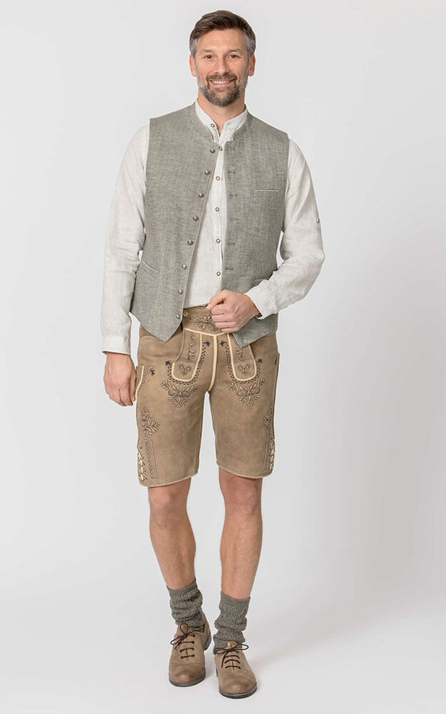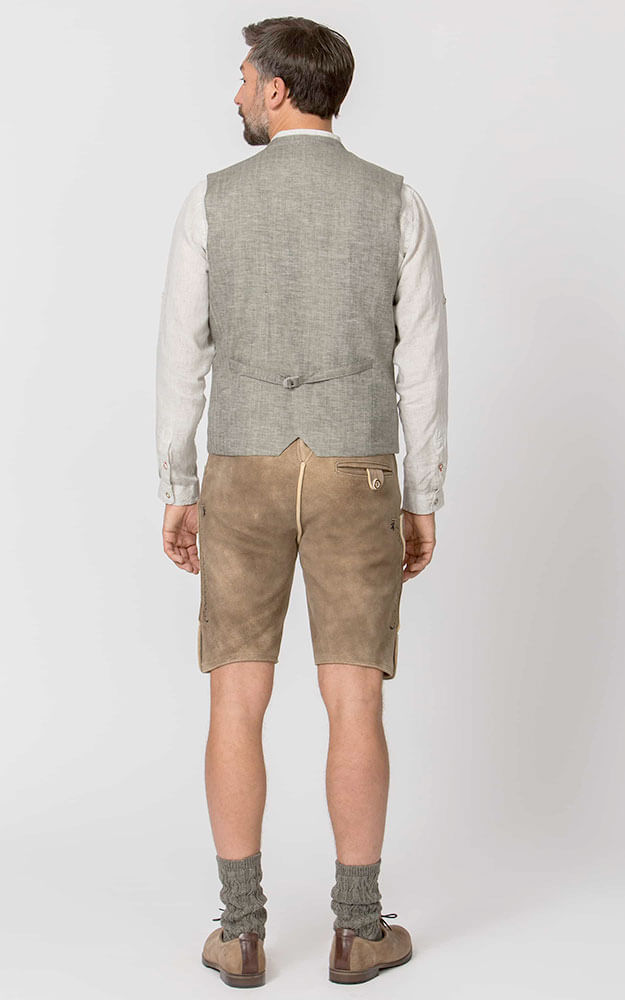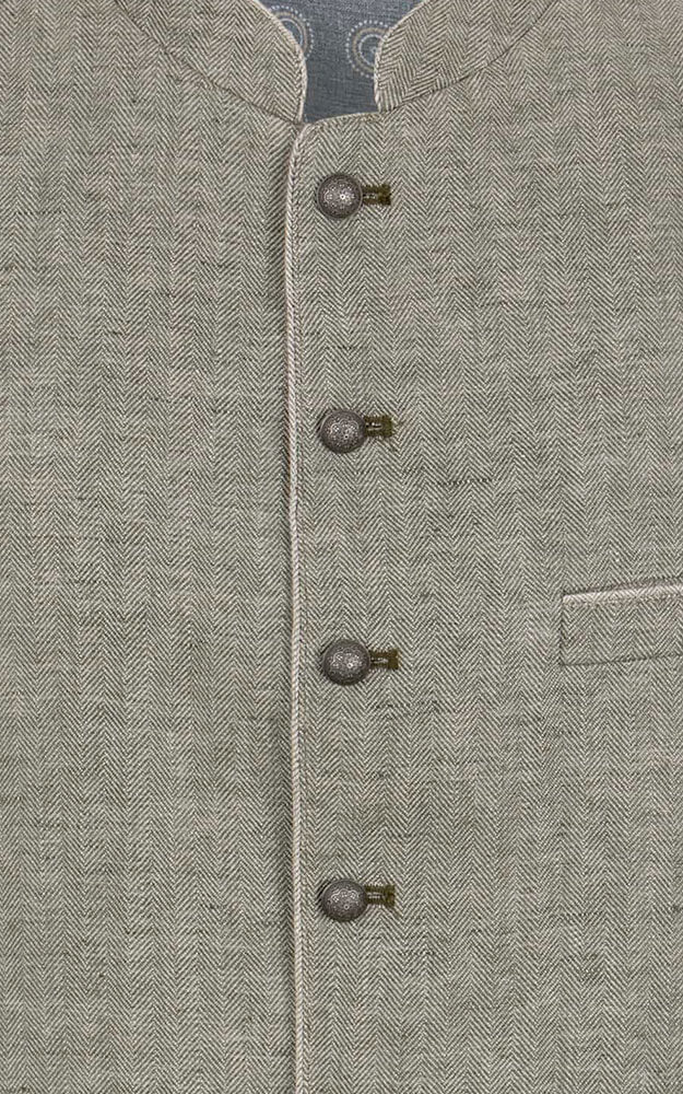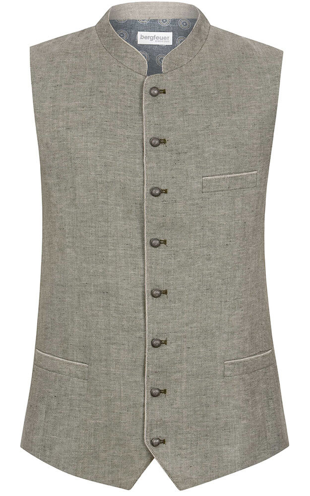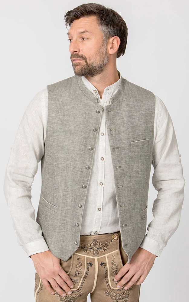 Trachtenweste Lucio überzeugt mit ihrem klassischen Design und hochwertigen Details. Der feine Leinenstoff mit edlem Fischgrat-Muster in Olive verleiht der Weste eine stilvolle und zugleich traditionelle Optik. Dank des sommerlichen Leinenmaterials ist die Weste besonders angenehm zu tragen. Der Stehkragen unterstreicht den authentischen Trachtenstil und macht die Weste zum idealen Begleiter für festliche Anlässe. Geprägte Metallknöpfe in Antikoptik setzen stilvolle Akzente und runden das Design harmonisch ab. Eine praktische Innentasche bietet zusätzlichen Stauraum für kleine Essentials. Das Rückenteil ist mit einem verstellbaren Riegel ausgestattet, um eine optimale Passform zu gewährleisten. Ob klassisch zur Lederhose oder modern mit Jeans kombiniert – die Weste Luzio ist ein vielseitiges Must-have für stilbewusste Trachtenliebhaber.
