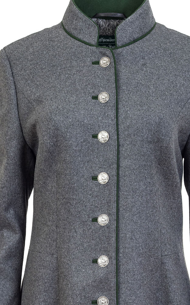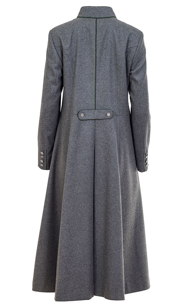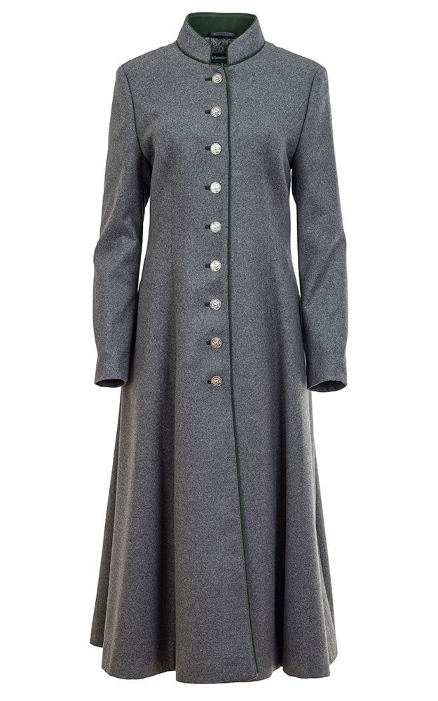 Eleganter Lodenmantel mit leichter Taillierung, tannengrünem Ausputz an den Kanten, Stehkragen sowie Metallknöpfen.