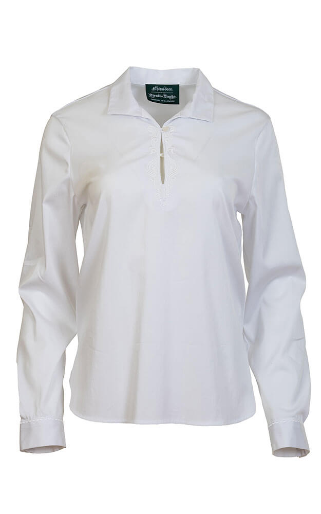 Duftige Trachtenbluse mit dezentem Ausschnitt und Stickereien an den Ärmeln.