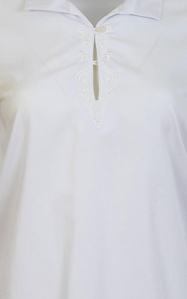 Duftige Trachtenbluse mit dezentem Ausschnitt und Stickereien an den Ärmeln. mehr