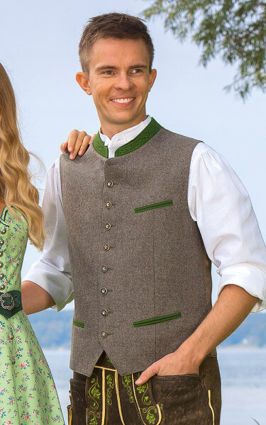 Weste aus reiner Schurwolle mit moosgrünem Ausputz, besticktem Kragen und schwarzem Taftrücken. Weitere abgebildete Artikel sind nicht im Preis enthalten.